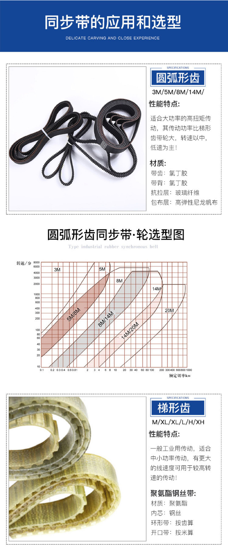 同步带是以钢丝绳或玻璃纤维为强力层,外覆以聚氨酯或氯丁橡胶的环形带,带的内周制成齿状,使其与齿形带轮啮合。同步带传动时,传动比准确,对轴作用力小,结构紧凑,耐油,耐磨性好,抗老化性能好,一般使用温度-20℃―80℃,v<50m/s,P<300kw,i<10,对于要求同步的传动也可用于低速传动。