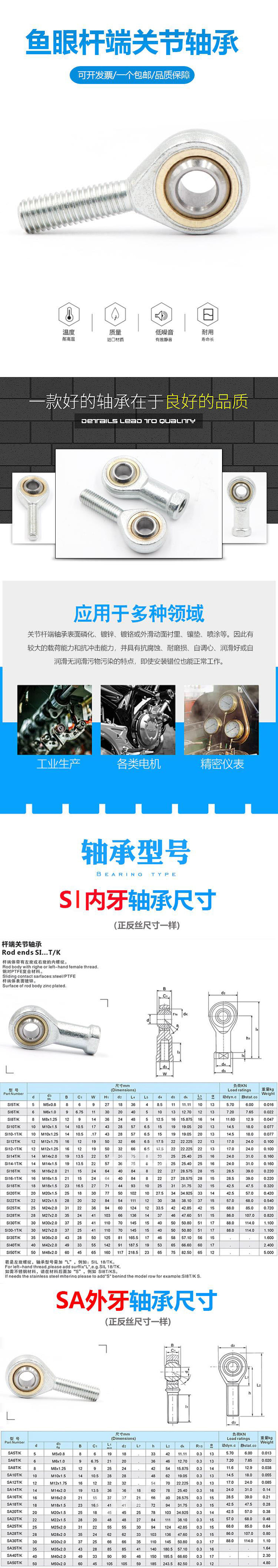 关节轴承能承受较大的负荷。根据其不同的类型和结构,可以承受径向负荷、轴向负荷或径向、轴向同时存在的联合负荷。