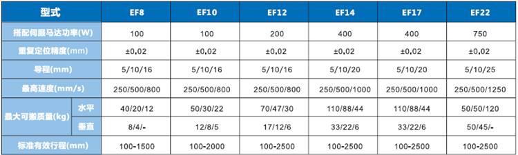 丝杆半封闭型线性模组 EF系列使用台湾直线导轨和C7级滚珠丝杆,重复定位精度0.02mm,在一般环境下使用,刚性好,底座T形螺母任意间距安装,价格低、交期短。